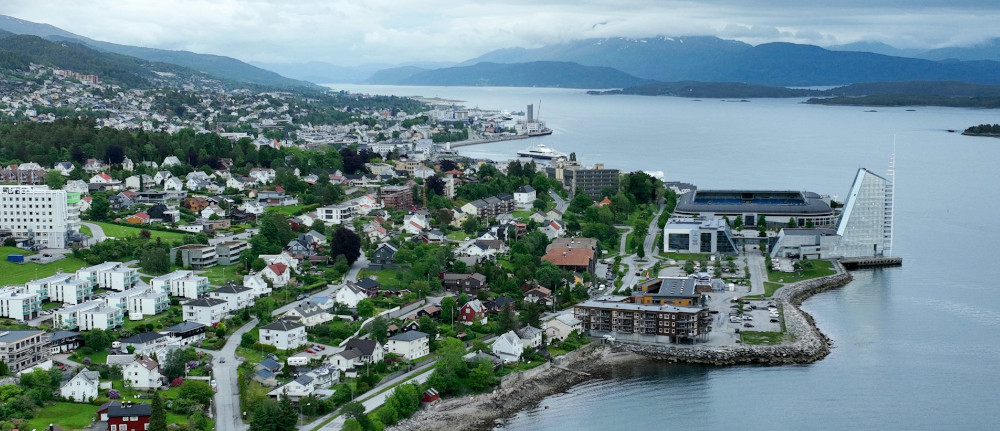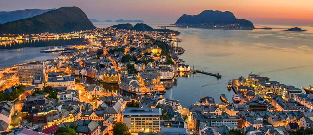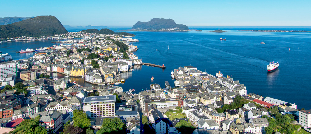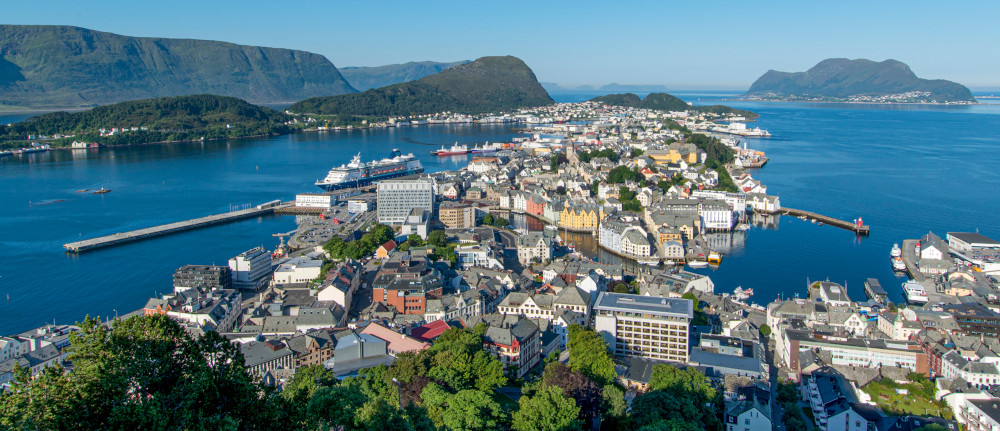 výhled na město, okolní fjordy a Sunnmørské Alpy.