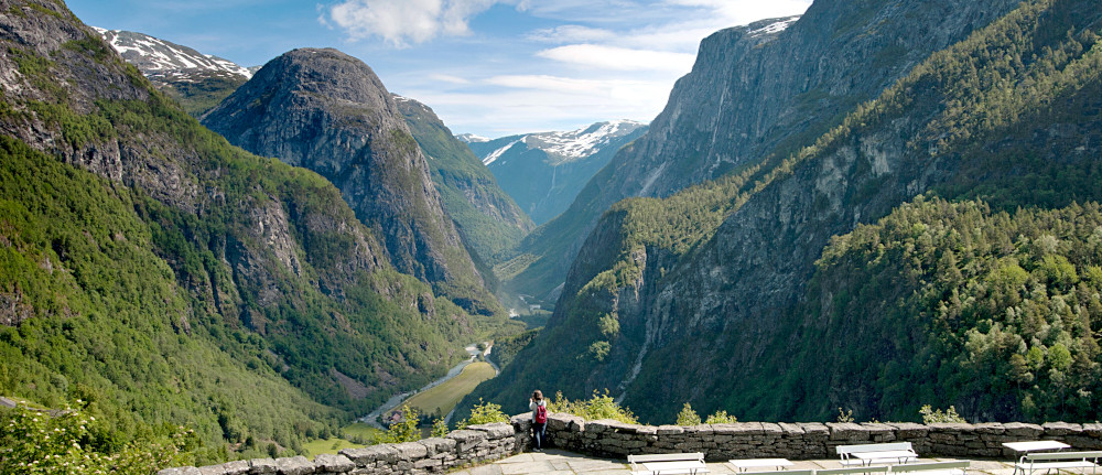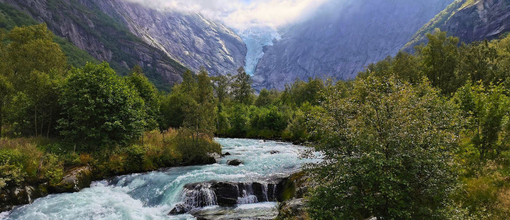 největšího norského ledovce Jostedalsbreen. V pozdních jarních měsících se okolní krajina promění v pohádkovou scenérii - z hor padají desítky vodopádů a mezi nimi rozkvétají horské květiny.