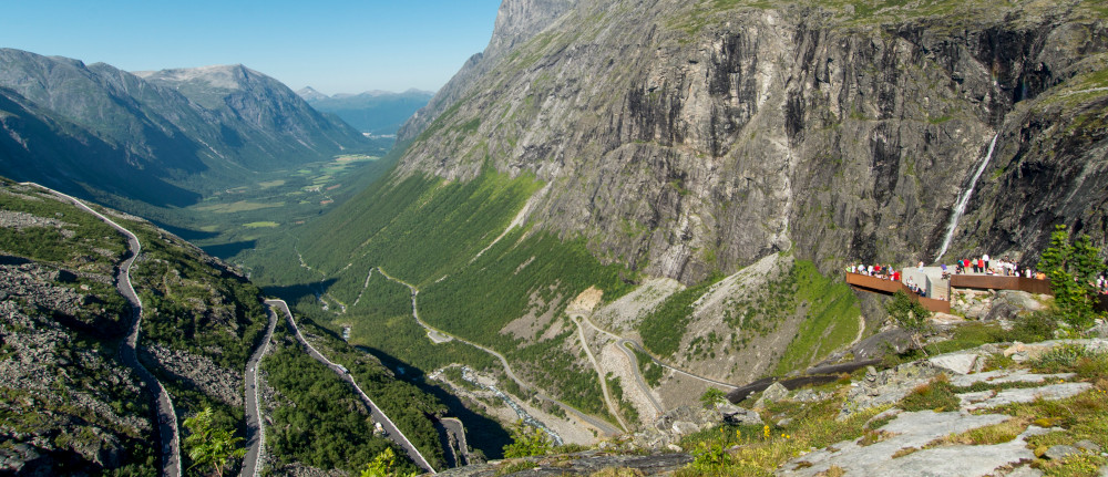 Trollstigen na okraji 200 metrů vysokého útesu, který vám nabídne dechberoucí výhled na údolí pod ním.