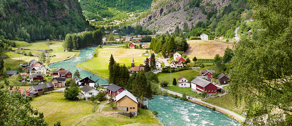 Flåm, ukryté mezi strmými horami a hustými lesy.
