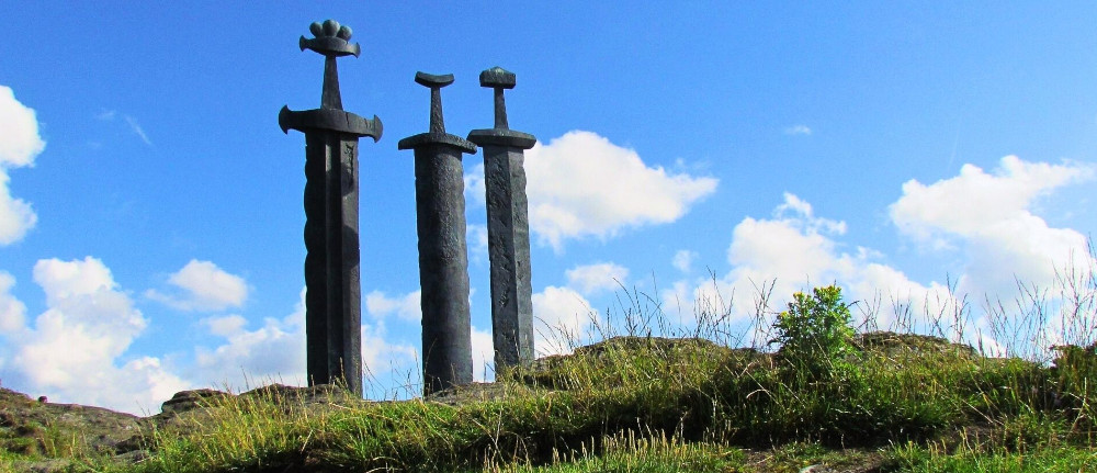 Tři meče ve skále, připomínající slavnou vikingskou bitvu z roku